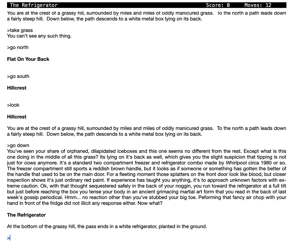 Unfortunately our interactive fiction text game (Avoidance Theory: An Interactive Refrigerator) no longer works online. However, if you can get your hands on a Z-machine interpreter (only know of Yazmin for macOS) you can download this avoid.z5 file and it should work on desktop.
